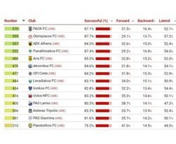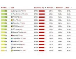 Στον δεύτερο πίνακα όμως βλέπουμε πως ο Ολυμπιακός έχει μεγαλύτερο ποσοστό ακρίβειας στις μεταβιβάσεις με 87.7%, Ενώ δεύτερος είναι ο Παναθηναϊκός με 87.4% και τρίτος ο ΠΑΟΚ με 87.1%.